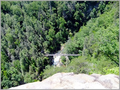 Jane Yarn was a conservationist who dedicated over thirty years of her life to the coastal waters of Georgia. Her work was vital to the protection of the barrier islands and marshes of along the coast of Georgia and, also, instrumental in national conservation legislature as well. She passed away in 1995 and the State of Georgia dedicated the Interpretive Center at Tallulah Gorge State Park in honor of her when it opened in 1996.Now for the photos promised earlier. The Park Rangers have several different viewing stations where they can keep an eye on what’s taking place in the Gorge. Everything is about safety and they are very diligent about enforcing the park rules. For those who violate the rules citations are given out which results in a fine of $116.00 per incident. These ranger viewing stations have no safety rails and are positioned at several locations throughout the Gorge. Yesterday afternoon I got to visit one of the ranger viewing stations with the Assistant Park Ranger, Michael Woods. It’s a good thing that I am not afraid of heights because we were about 1000 feet above the Gorge floor and it was straight down. Here are the photos: